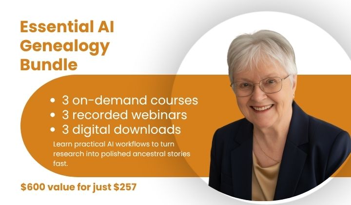 BundleThree hands-on courses plus a suite of recorded webinars. Downloadable prompts, templates and writing guides within. Learn practical AI workflows to turn research into polished ancestral stories fast. Special offer for December 2025.