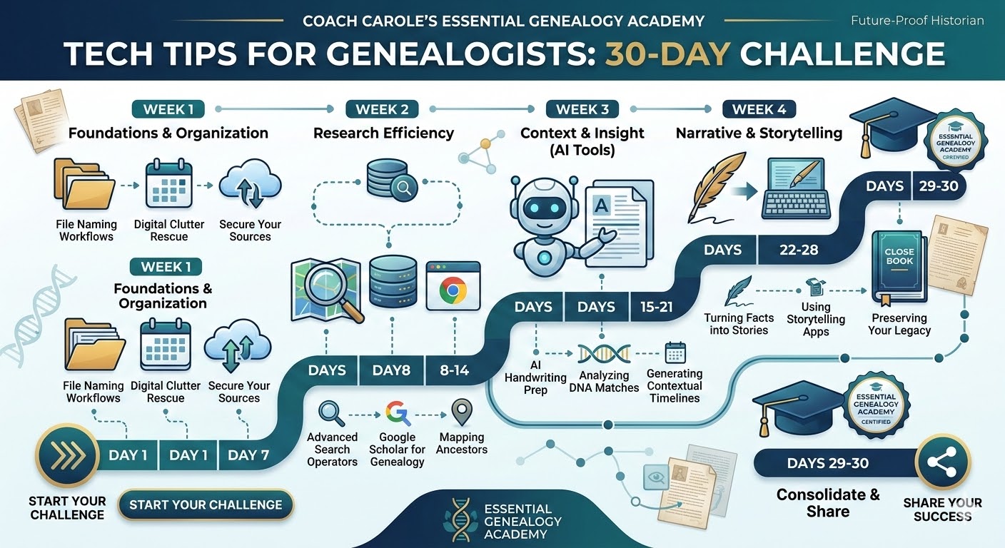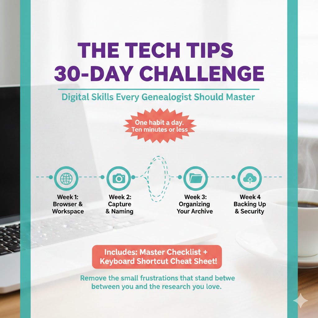 The Tech Tips 30-Day Challenge is a transformative digital skills bootcamp for genealogists. Over four themed weeks, you'll enhance your tech proficiency, streamline your research browser, and establish a structured file naming system. Join us on this journey to optimize your family history workspace and uncover your ancestors' stories with ease.